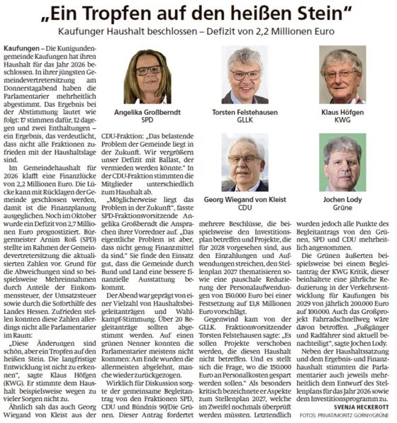 - Konzeptloses Kürzen statt vorausschauender PlanungBei der letzten Sitzung der Gemeindevertretung hat die GLLK insgesamt 14 Änderungsanträge zum 38-Millionen-Euro-Haushalt eingebracht. Ziel war es, soziale und ökologische Aspekte stärker zu berücksichtigen und den Haushalt zukunftsfähig zu gestalten. Über drei Stunden… Konzeptloses Kürzen statt vorausschauender Planung weiterlesen